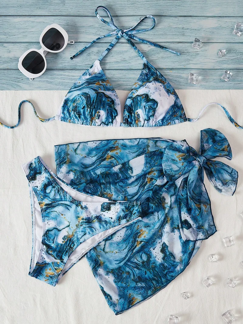Conjunto de 3 piezas triángulo halter con estampado de mármol con falda de playa