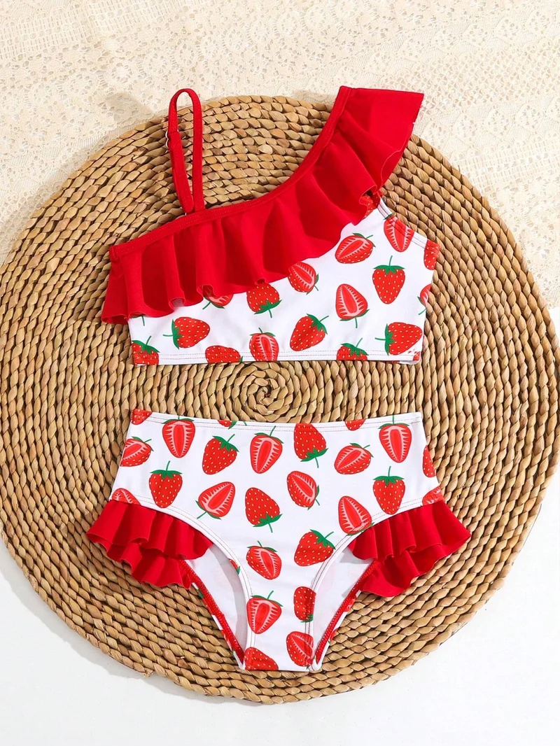 Bikini con estampado de fresa, hombro asimétrico y ribete de volantes para niña